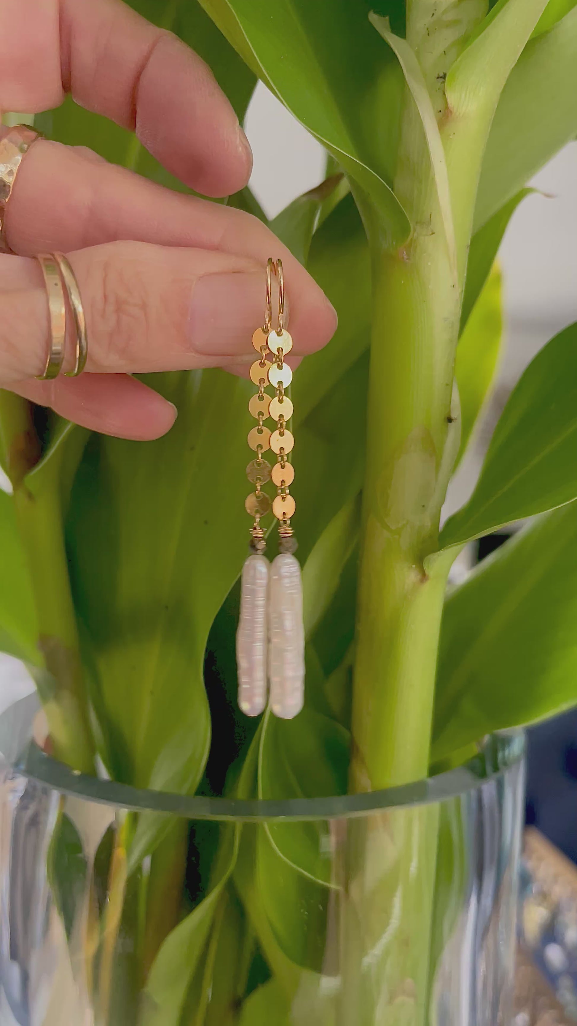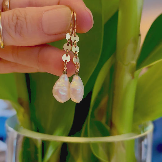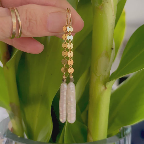 - Made with Heirloom stick pearls, pyrite and 14K Gold Fill sequins. Approximately 2.5 inches long.