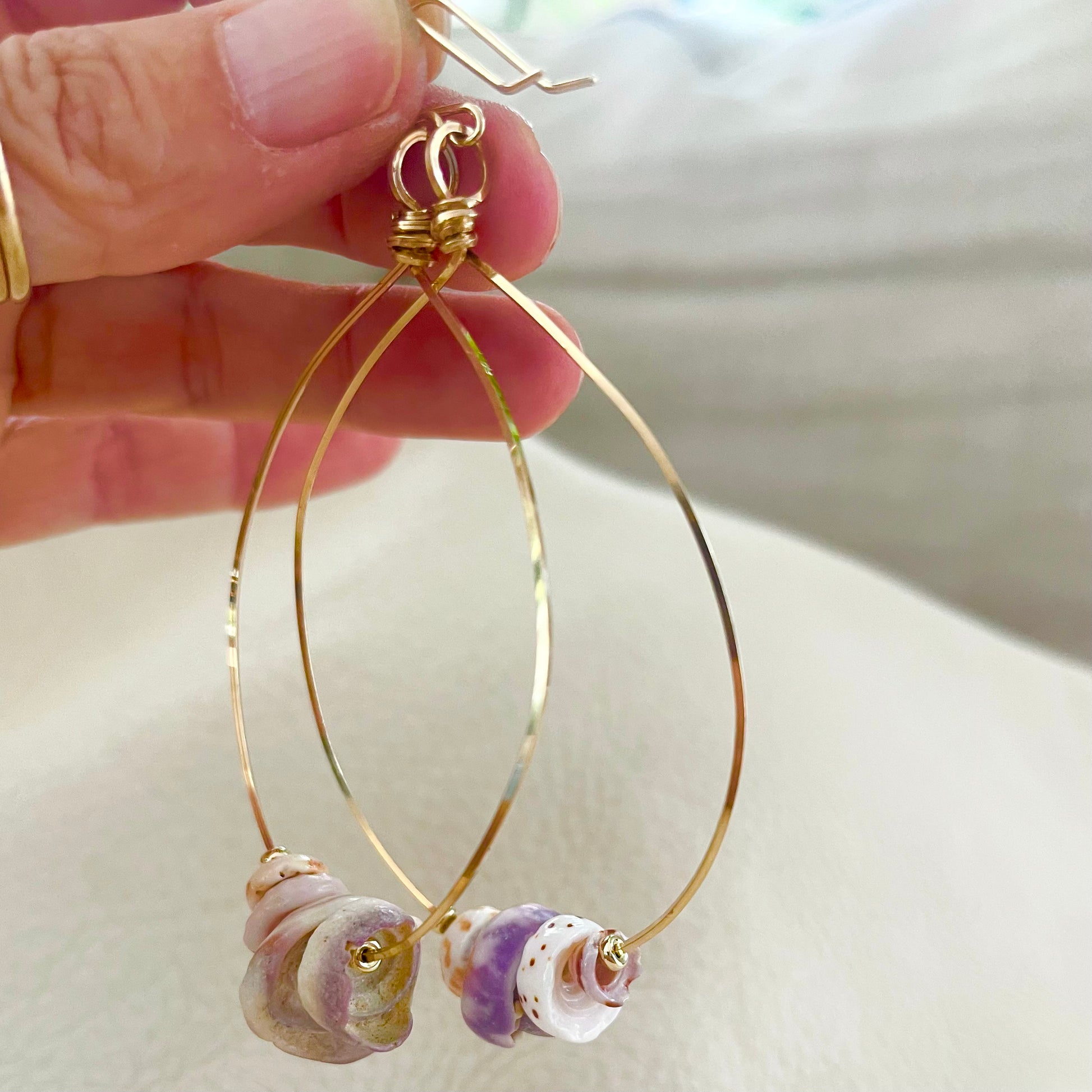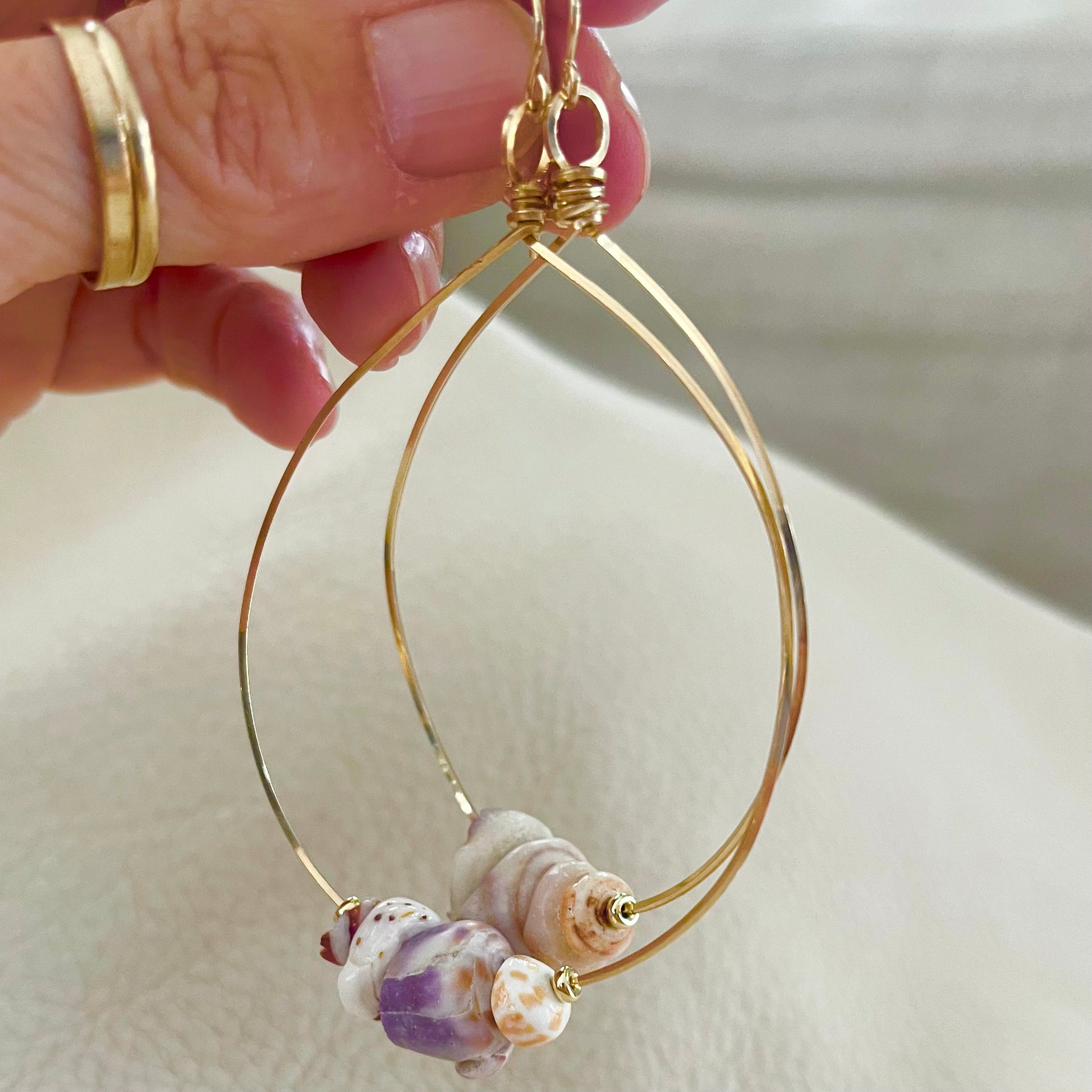 This hoop is made of foraged Puka shells and one of a kind