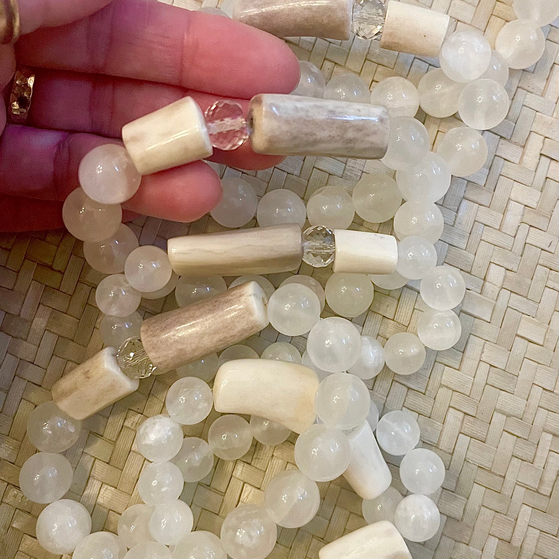 Creamy moonstone beads pair with shed antler tips and Swarovski to create grit and grace.