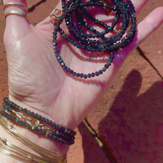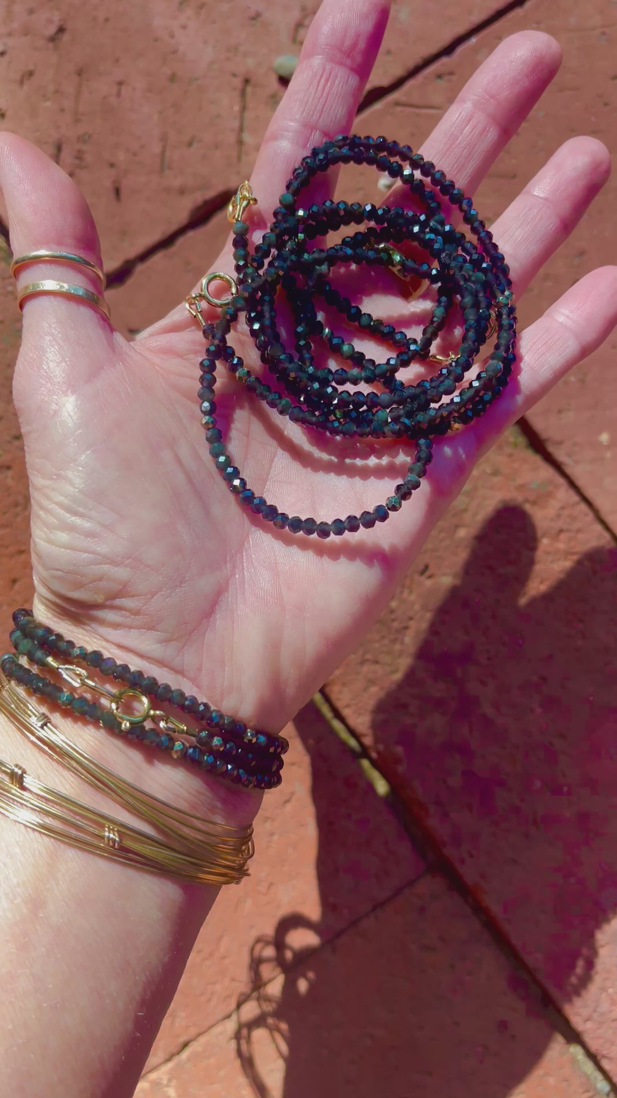 - Style tip: Made to wear wrapped three times around the wrist, layered with other necklaces or on its own around your neck. A truly versatile peice!