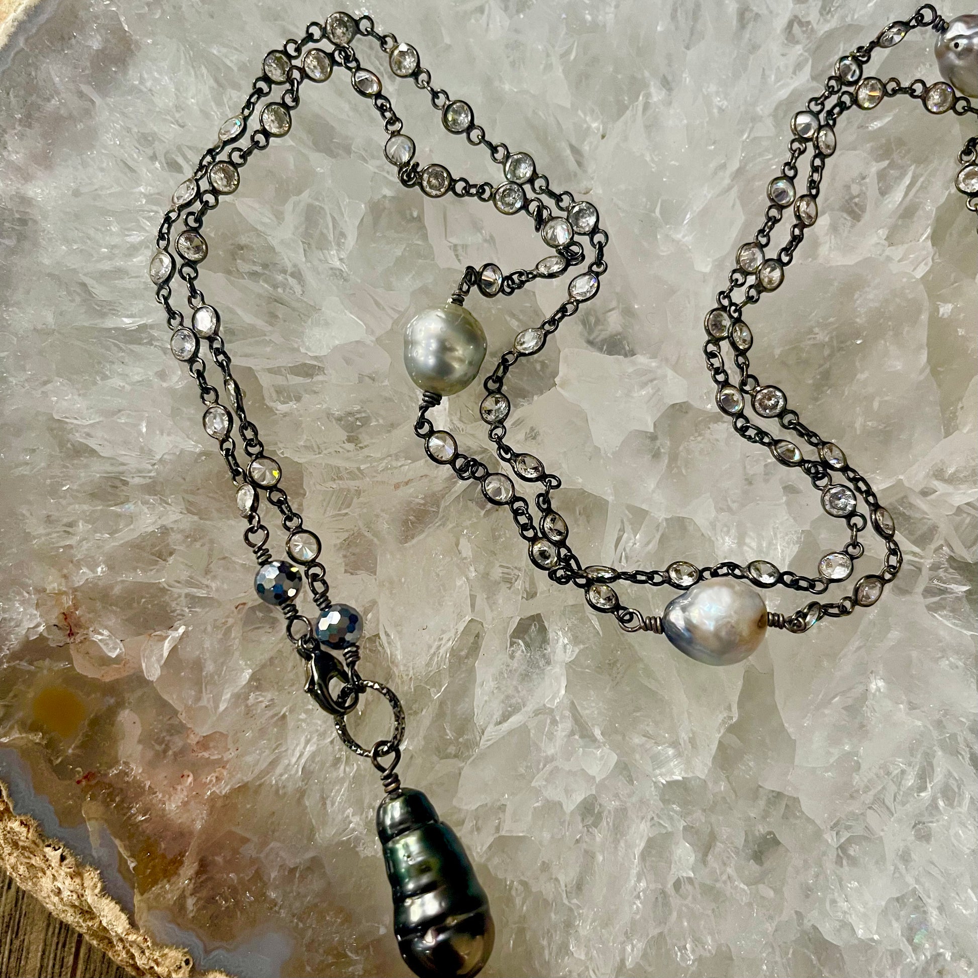 - Zircon Bezel chain, Terrahertz accents and a beautiful Tahitian pearl with oxidized sterling silver hardware.