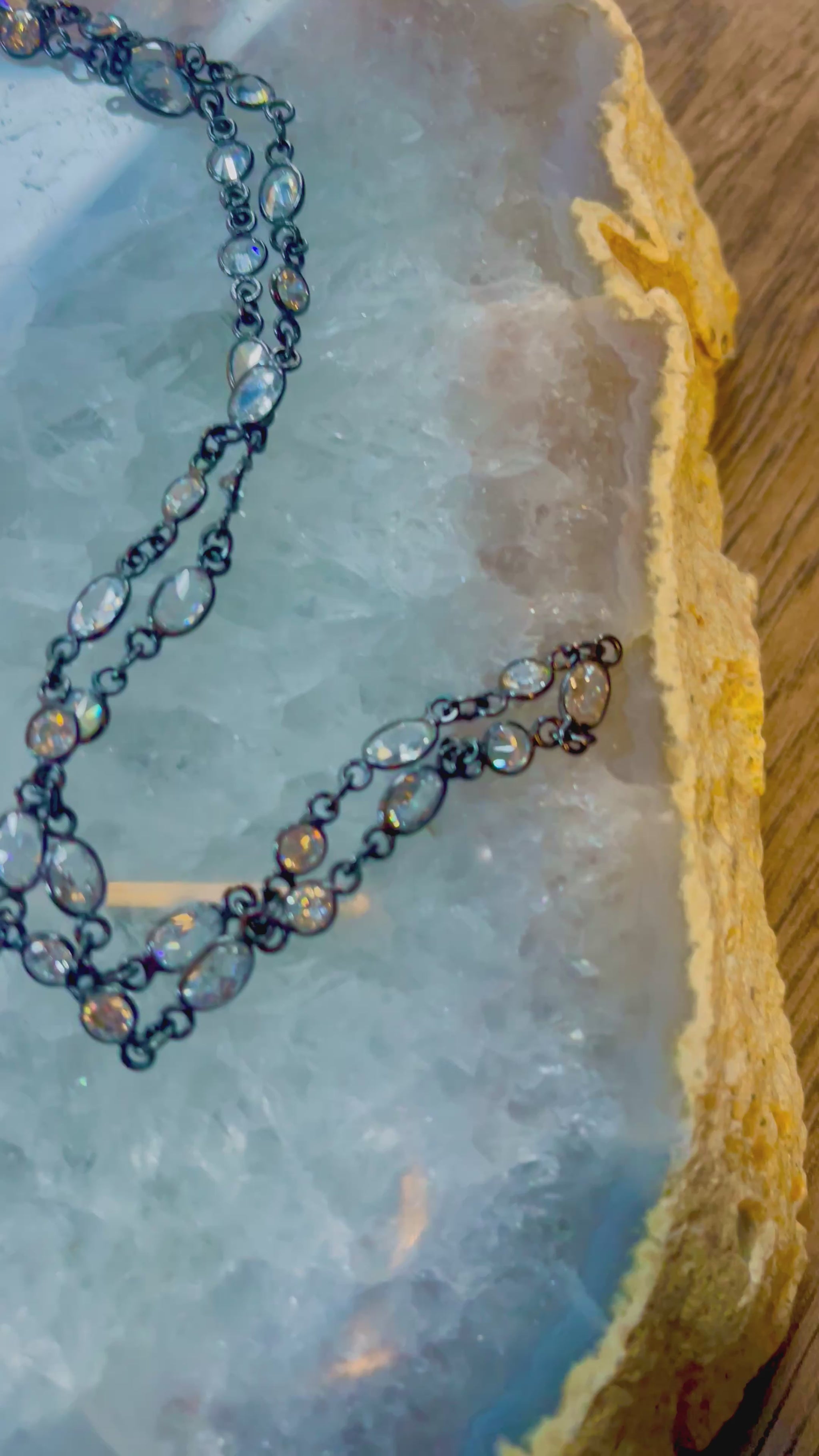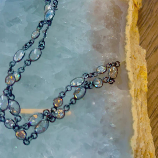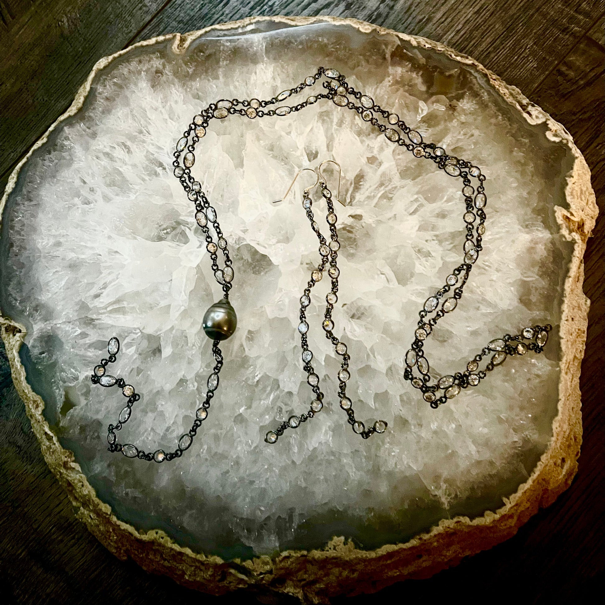 The Zircon is a natural gemstone with exceptional fire and clarity, often mistaken for a diamond. The stones in this bracelet are set in oxidized sterling silver creating something uncommon when paired with the satellite chain and diamond cut ring and Tahitian at the end.